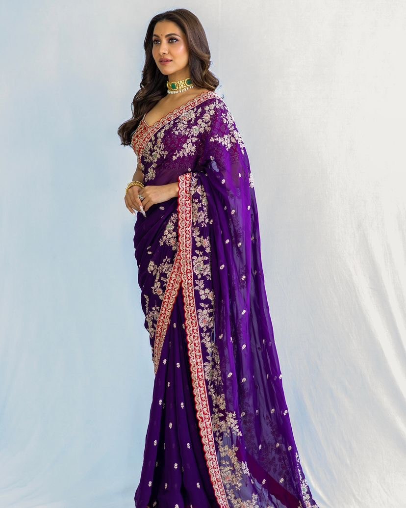 Elevate your ethnic style with this stunning designer purple georgette saree, adorned with intricate golden zari embroidery and paired with a heavily embroidered red blouse. Perfect for weddings, receptions, festive celebrations, and special occasions, this saree blends traditional elegance with a modern glamorous touch.